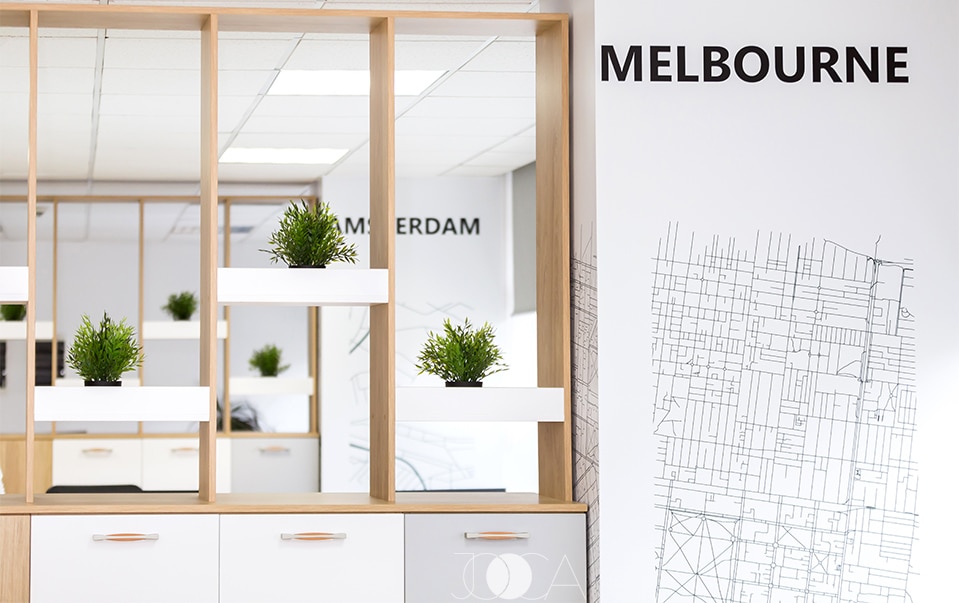 Folie wall art imprimata - pentru stalpii de rezistenta aflati in spatiu, fetele de la Jooca au dort colantarea lor integrala cu harta unui oras specific : Amsterdam, Melbourne, Barcelona si Cape Town. Am folosit o folie speciala pentru pereti ,,Wall Art,, imprimata la rezolutie foto conform design. Au iesit niste harti dragute care au achimbat total aspectul unor stalpi banali